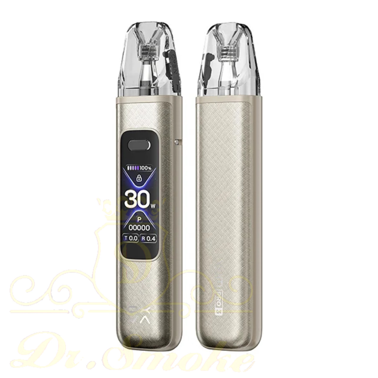 OXVA Xlim Pro 3 با روکش مشکی و طلایی با صفحه نمایش که خروجی 30 وات و 100٪ باتری را نشان میدهد.